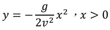 當一個物體作水平拋射運動,不考慮空氣阻力,移動軌跡為拋物線,滿足下方二次函數的關係式。 其中 x 表示水平移動距離、y 表示垂直移動距離、v 表示拋射速度,以及重力加速度 g=9.8m/s